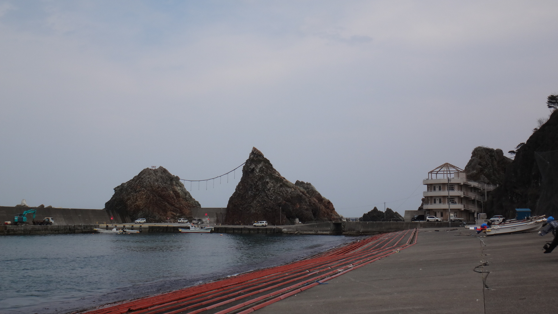 そのため、片道5分程度で済むのならまだ時間はあると思って迂回路に向かうと、10分以上も山道をウロウロする羽目になり、最後に海女センターに到着したのですが、滞在できる時間が全く残っておらず、やむなく海岸の立派な夫婦岩と「じぇじぇじぇの碑」の写真だけを撮影して後にしました。